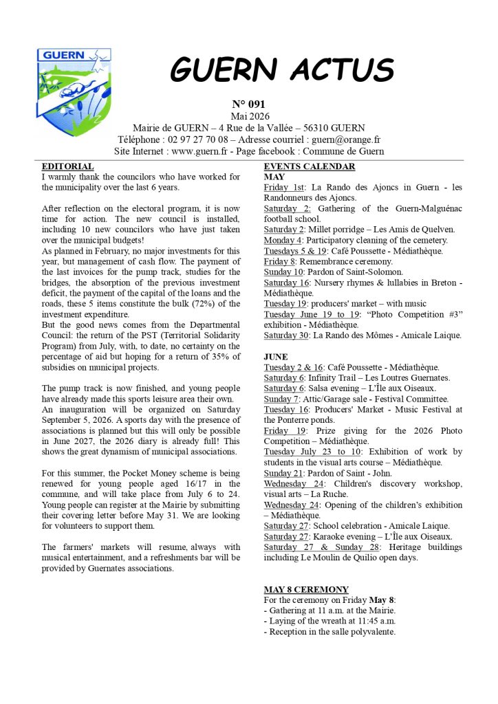 Forte de 1403 habitants, GUERN saura vous séduire par l’alternance de ses vallons verdoyants et de ses bois, ses authentiques chemins creux, ses ruisseaux, ses moulins, ses nombreuses chapelles, ses vieilles demeures, ses traditions riches et toujours vivantes. Notre-Dame de Quelven, du haut de sa tour, veille sur notre ruralité.