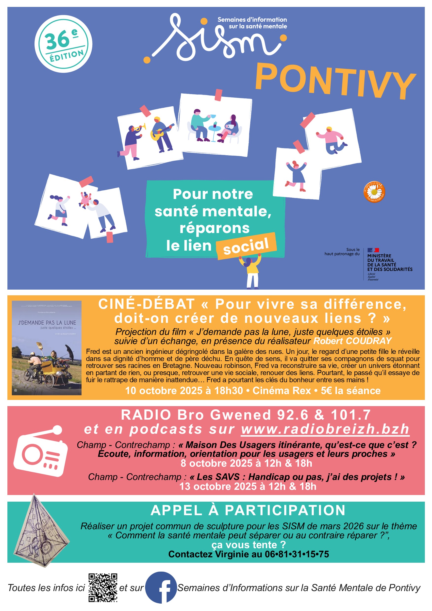 La santé mentale, un tabou? Non, une CHANCE!! Un programme sur 2 semaines pour échanger et construire le vivre ensemble de demain sur le territoire de Pontivy. Venez nombreux!!