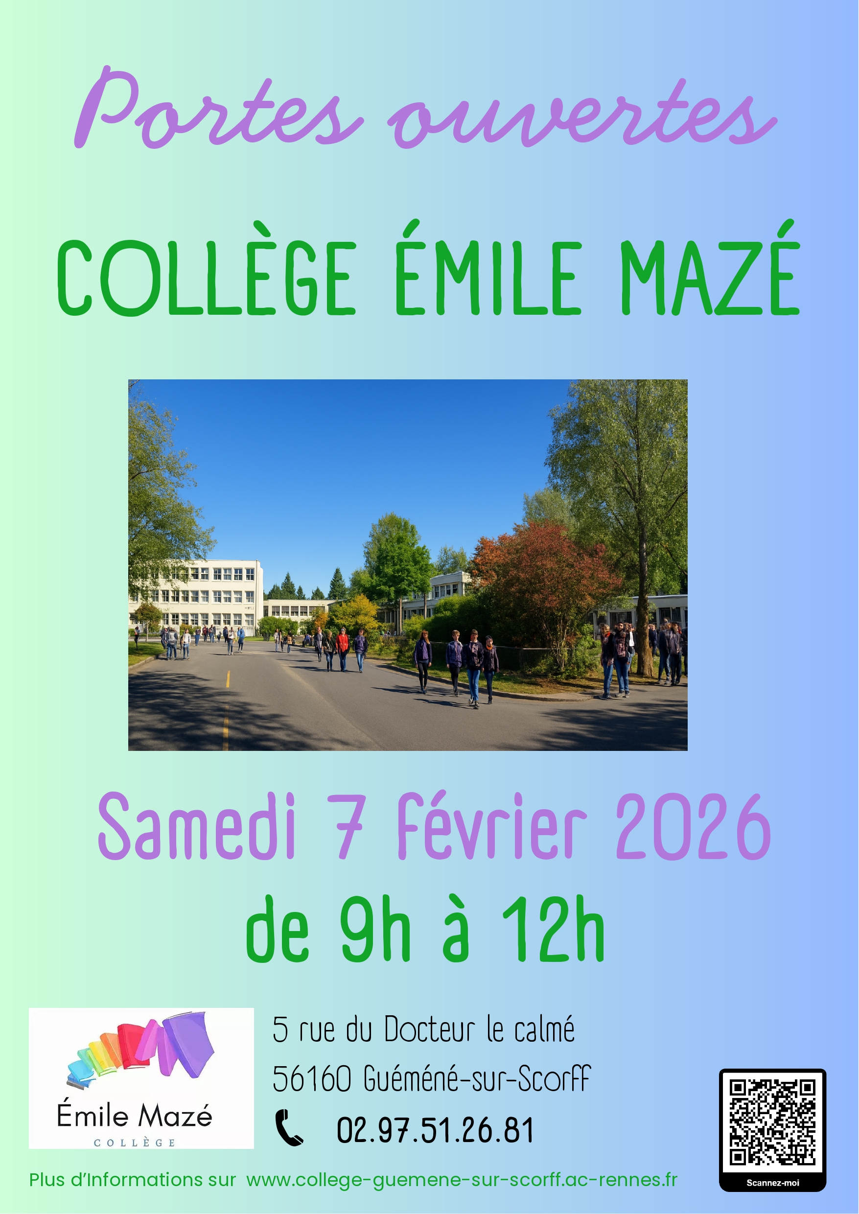 Madame la principale du collège, les personnels de l’établissement et les élèves auront le plaisir de vous recevoir à la matinée “Portes ouvertes” du collège Emile MAZE de Guémené-sur-Scorff