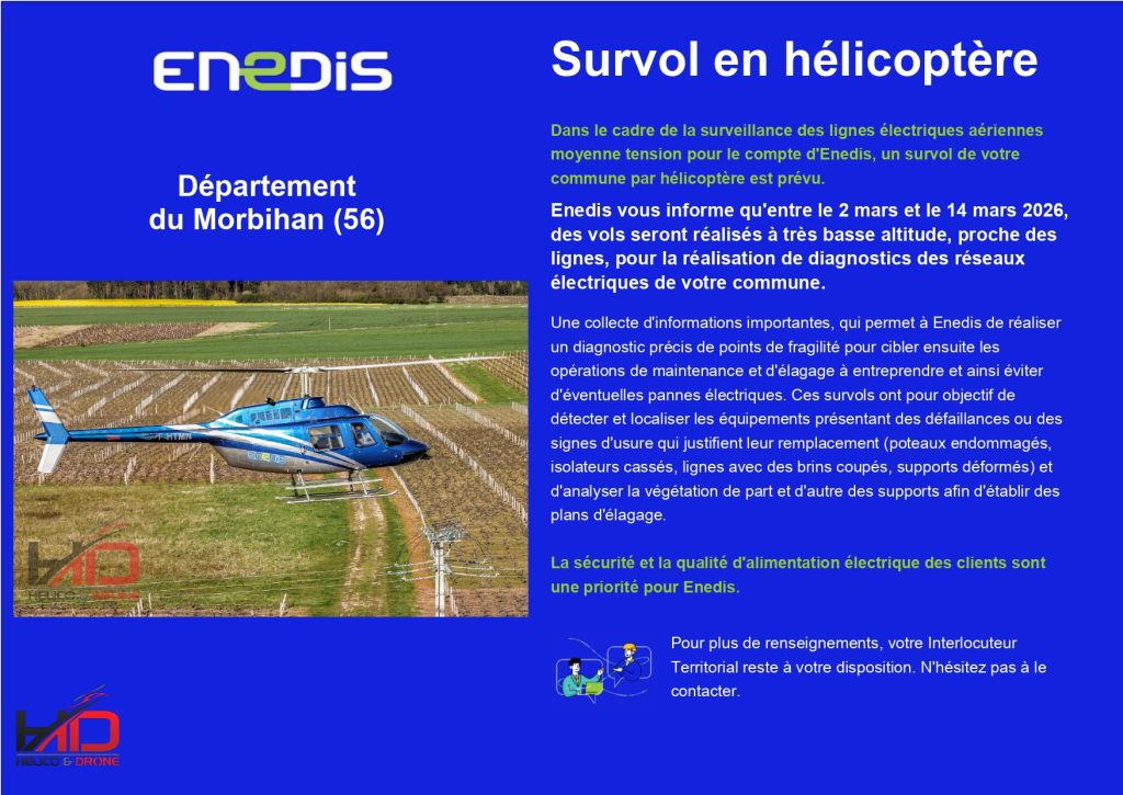 Dans le cadre de la surveillance des lignes électrique d’ENEDIS, un hélicoptère survolera la commune à très basse hauteur.