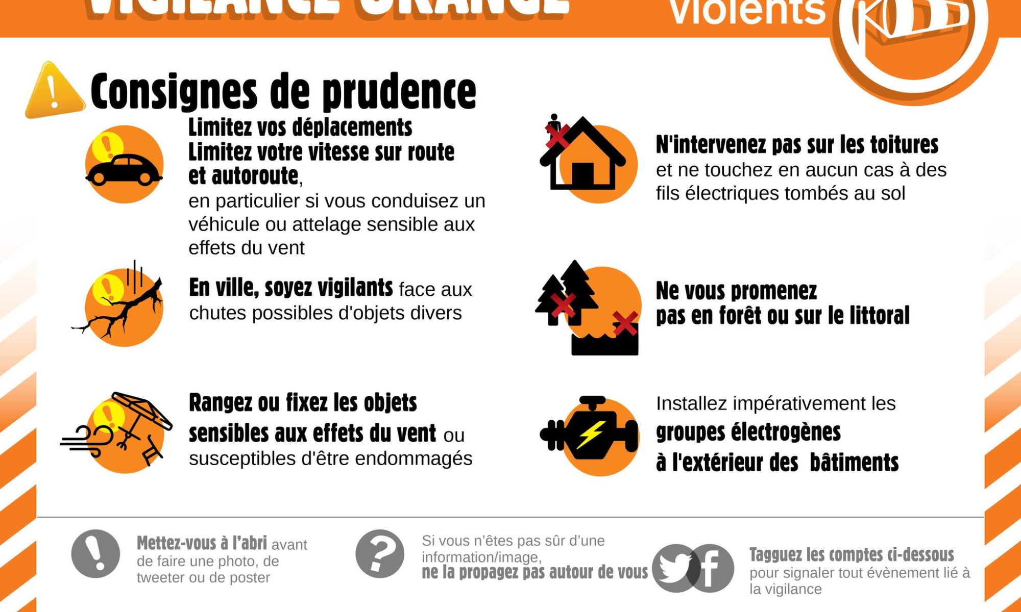 – Tenez-vous au courant de l’évolution de la situation en écoutant les informations diffusées dans les médias – Evitez de circuler en bord de mer à pied ou en voiture