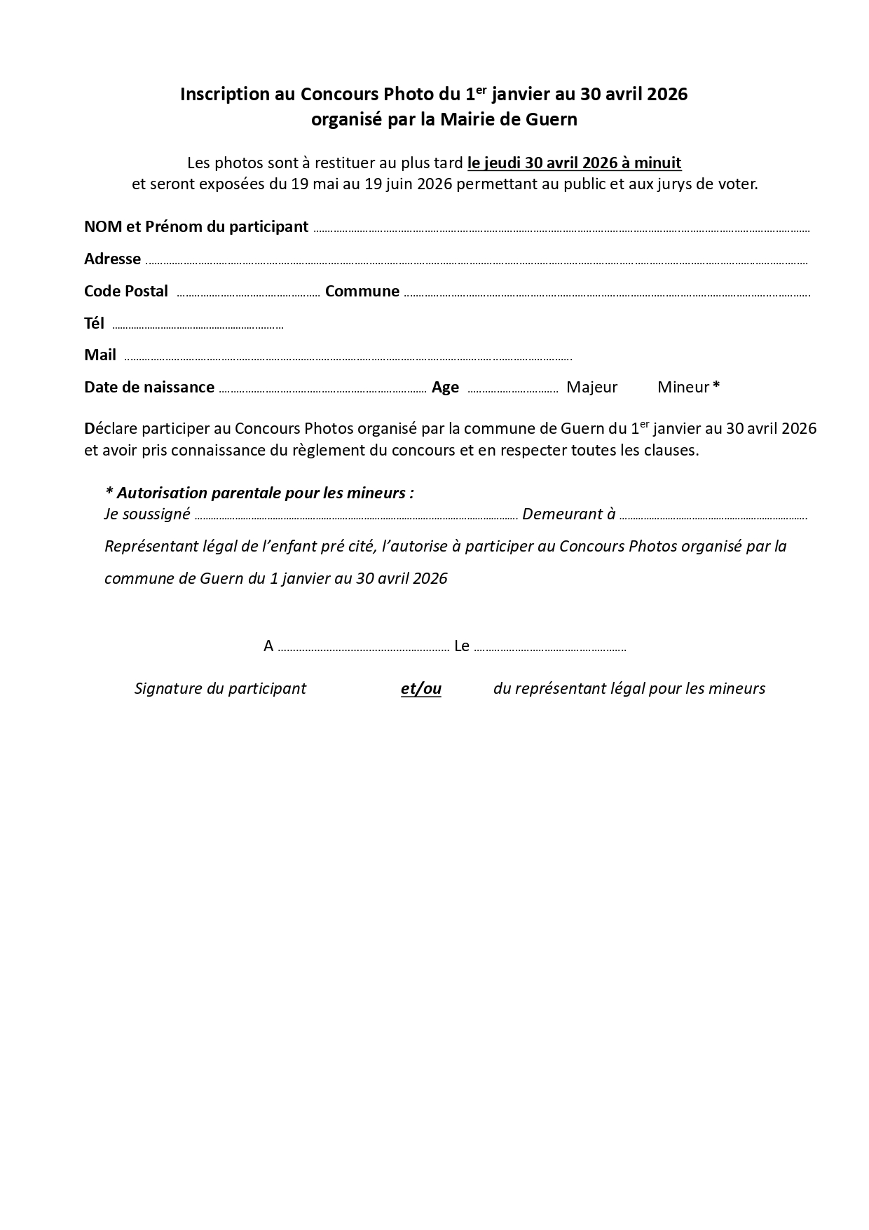 Pour participer, il est nécessaire de remplir le bulletin d’inscription (en annexe au règlement). Possibilité de le demander à la mairie ou la médiathèque de Guern, ou de le télécharger à partir du site de la commune : www.guern.fr