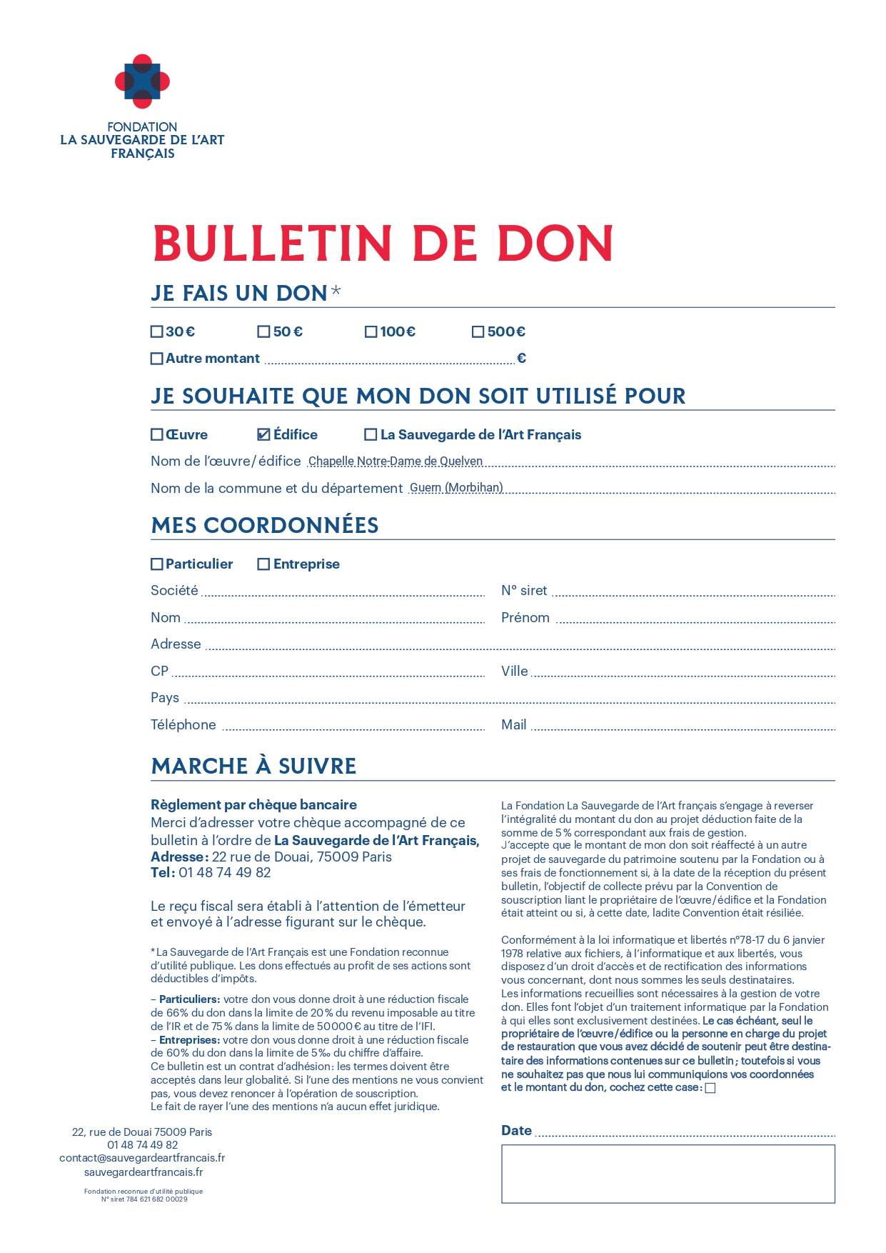 Comment agir :1. Rendez-vous sur la page dédiée à la chapelle Notre-Dame-de-Quelven de Guern ou en téléchargeant le Bulletin de don sur le site www.sauvegardeartfrancais.fr/chapelle-de-quelven